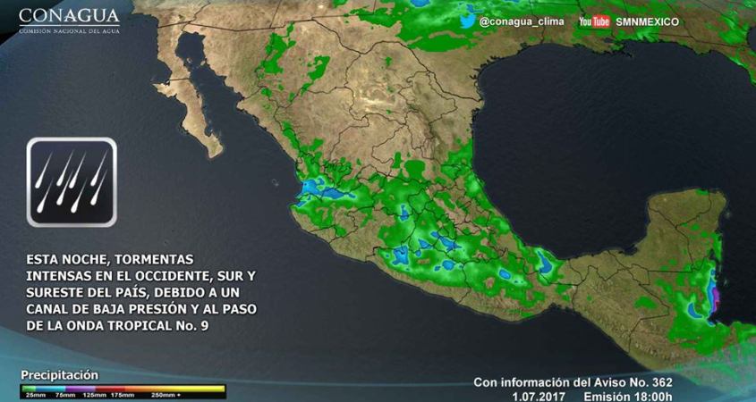 Intervalos de chubascos con tormentas puntuales fuertes (25 a 50 mm): Nayarit, Jalisco, Colima, Estado de México, Ciudad de México, Morelos, Campeche, Yucatán y Quintana Roo.