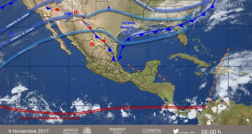 Para hoy, el frente frío No. 9 se extenderá sobre el norte y noreste de México, su masa de aire frío favorecerá descenso de las temperaturas y vientos superiores a 60 km/h en dichas regiones y rachas de viento superiores a 70 km/h en el Istmo y Golfo de Tehuantepec.