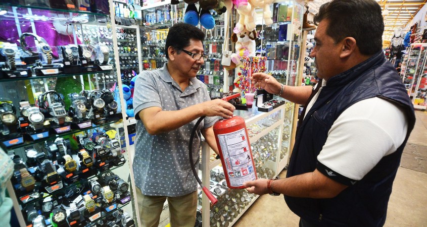 El titular de la dependencia Daniel León Morales entregó a comerciantes los extinguidores y otros fueron colocados en las puertas principales de acceso a ese centro comercial.