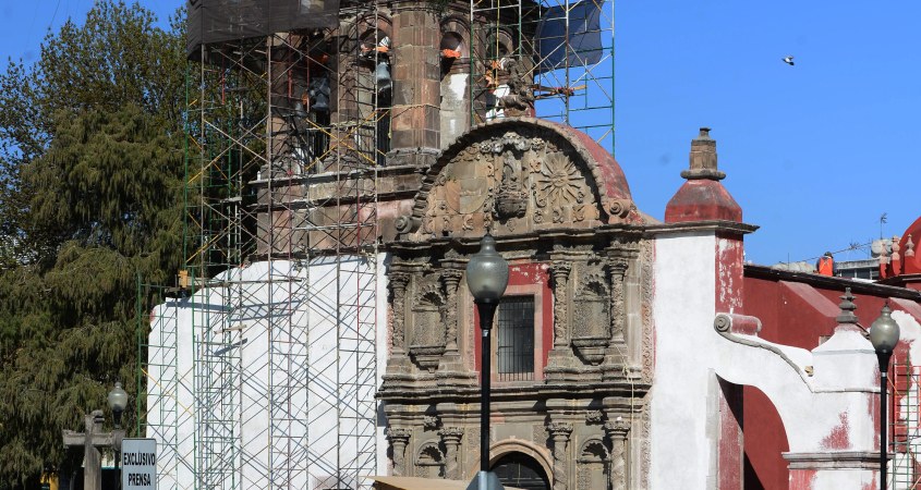 Los trabajos en proceso que iniciaron el 4 de Diciembre de 2017 consisten en el montaje de andamios sobre el perímetro de la torre, la reintegración de aplanados de la fachada principal y contrafuerte derecho, aplanados en la torre, limpieza en seco y húmedo sobre elementos de cantera, realización de limpieza química húmeda en zona de cornisas de cantera, retiro de instalaciones eléctricas en la nave principal, limpieza de la cúpula que se prepara para la integración del impermeabilizante acrílico.