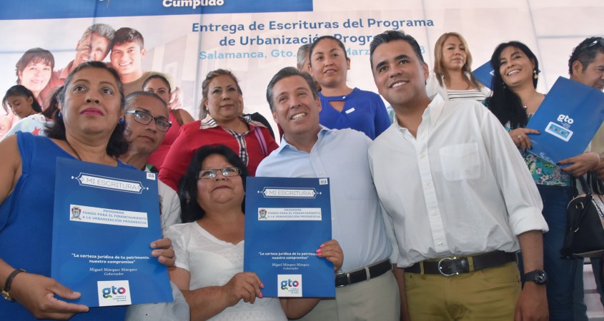El presidente municipal de Salamanca Antonio Arredondo Muñoz, en compañía del Gobernador del Estado Miguel Márquez Márquez y autoridades estatales realizó la entrega de escrituras bajo el programa de urbanización progresiva a los habitantes del fraccionamiento Palo Blanco, refrendando de esta manera el compromiso por brindar a los Salmantinos oportunidades para que vivan de una manera digna.