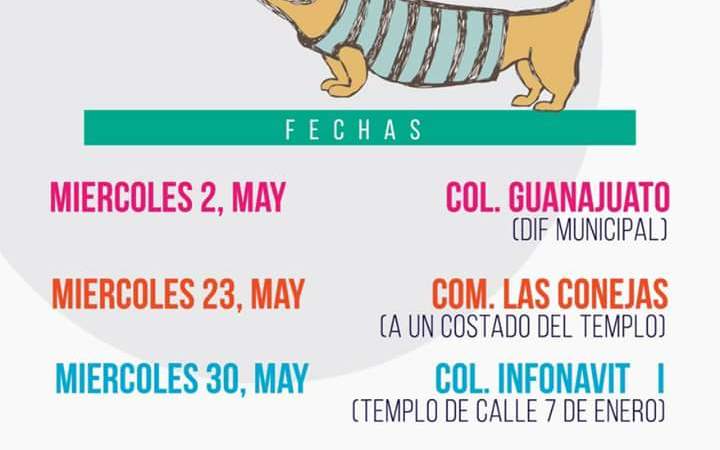 Informó que las próximas fechas en las que se estarán llevando a cabo las esterilizaciones, darán inicio el día miércoles 2 de mayo en la colonia Guanajuato en las instalaciones del DIF Municipal, posteriormente el miércoles 23 de mayo en la comunidad Las Conejas a un costado del templo, y por último el miércoles 30 de mayo en colonia Infonavit I en el templo que se encuentra ubicado en la calle 7 de Enero.