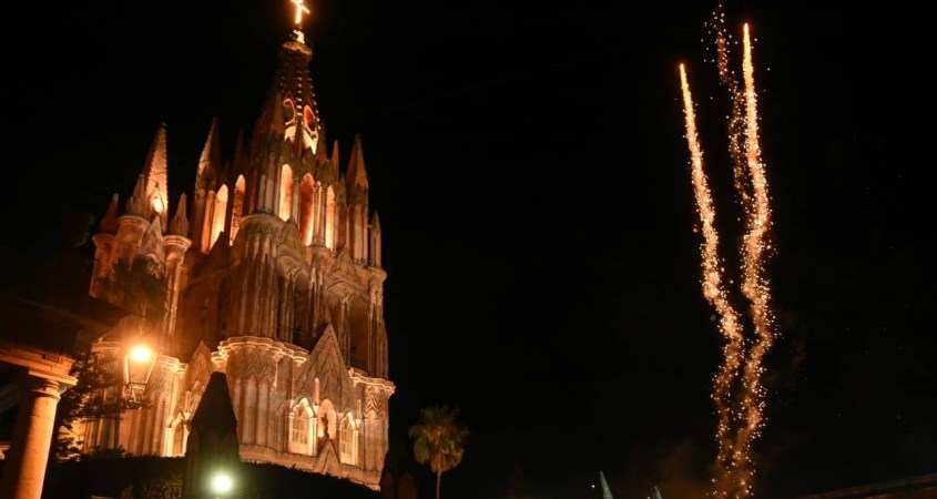 Tras la arenga “Ignacio Allende, murió por la patria” en voz del cronista de la ciudad, la Parroquia de San Miguel Arcángel y la explanada del Jardín Principal se iluminaron con fuegos artificiales.