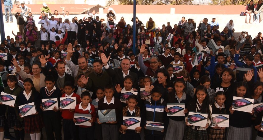 En total serán mil 200 las tabletas electrónicas que repartirá en más de 500 escuelas, pero hoy realizó dos eventos, uno en la Escuela Primaria Gabriela Mistral y otro en la General Miguel Alemán en la comunidad de Cerritos. Los próximos días realizará dos eventos más para completar la entrega.