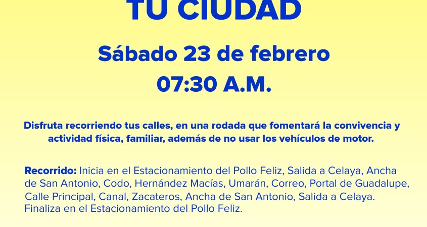El llamado es a las familias sanmiguelenses, a llevar su bicicleta, congregarse en el estacionamiento del “Pollo Feliz” de Salida a Celaya, y en punto de las 7:30 de la mañana partir sobre la ruta destinada para conocer y disfrutar de la ciudad.