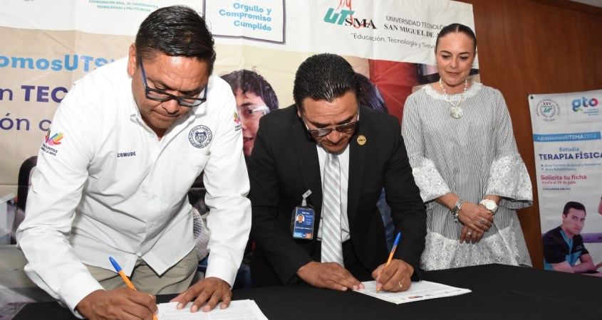 Con el objetivo de que los estudiantes pongan en práctica los conocimientos aprendidos en las aulas de clases, la Comisión Municipal del Deporte (COMUDE) firmó esta tarde un convenio con la Universidad Tecnológica de San Miguel de Allende (UTSMA) beneficiando a 35 estudiantes de la carrera de Terapia Física.
