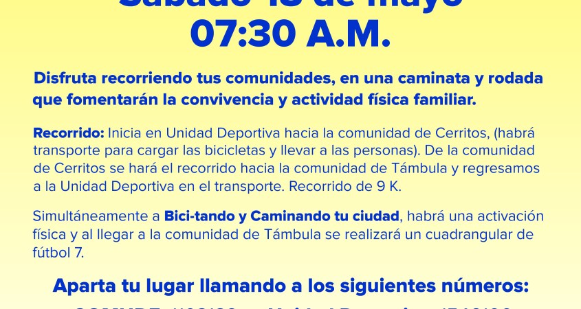 El recorrido consta de 7 kilómetros de la comunidad de Cerritos a Támbula; el regreso a la Unidad Deportiva nuevamente será en transporte. En simultáneo a Bici-tando y Caminando tu ciudad, habrá una activación física en Támbula.