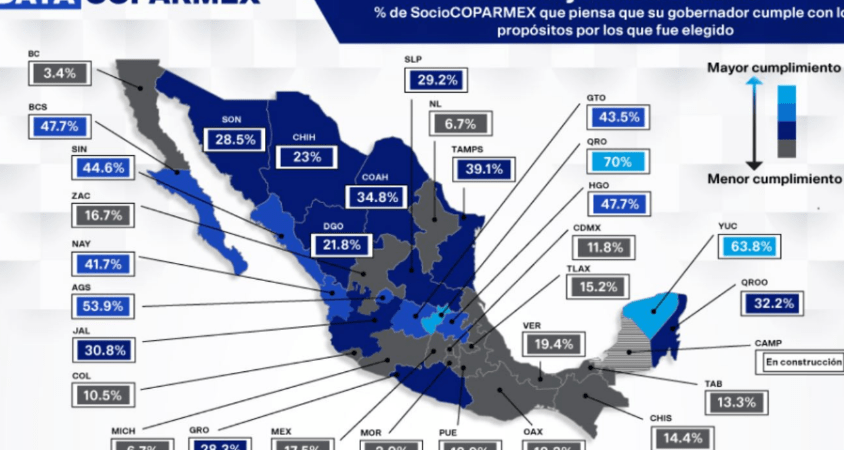 Según el último reporte de Data Coparmex correspondiente al cuatrimestre julio-octubre, la media nacional es que el 29 por ciento de los socios de la confederación patronal considera que su gobernador está cumpliendo con los propósitos para los que fue electo.