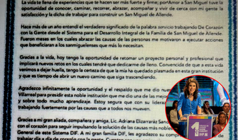 Con una emotiva carta Susana Chauvet, presidenta de DIF San Miguel de Allende, se despidió de su cargo, el presidente municipal Luis Alberto Villarreal con mensaje en redes sociales, corroboró el hecho.