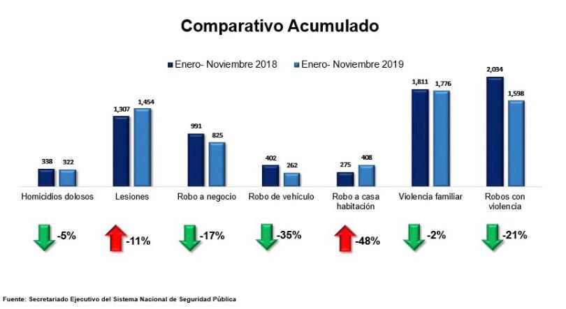 En el acumulativo de enero a noviembre de 2018 al mismo periodo de 2019, los robos con violencia, robo a negocio, de vehículos y violencia familiar registran disminuciones.