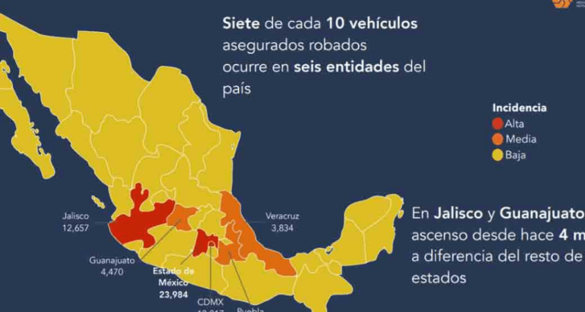 Además, en solo nueve entidades se concentra el 80 por ciento de los robos de autos que fueron cometidos con violencia, y entre ellos está Guanajuato, con 3 mil 124 casos, que representan el 6 por ciento del total nacional de registros.