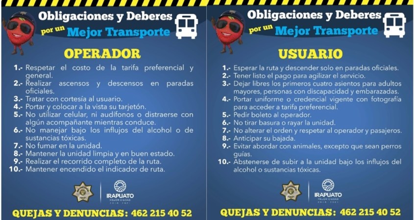 En el caso de los choferes, deberán contar con su documentación a la vista, realizar ascensos y descensos en la paradas autorizadas, deberán respetar la tarifa preferencial y general, no fumar en la unidad, mantener encendido el indicador de ruta y no utilizar celular, audífonos o distraerse con acompañantes.