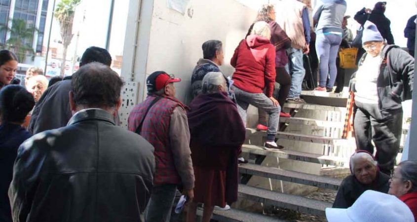 Debido a que todavía no reciben su tarjeta bancaria para poder cobrar la pensión del programa “68 y más”, cientos de personas de la tercera edad en León tienen que hacer filas durante horas en las oficinas de Telecomm para obtener su dinero.