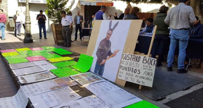 La manifestación de comerciantes inconformes, que comenzó la mañana del martes, continúa este miércoles afuera de presidencia municipal en donde volvieron a colocar pancartas. Sin embargo, hoy destaca una en la que recrimina al director de Fiscalización y Control de reglamentos Gustavo Bück González por haberlos dejado plantados ayer en dos ocasiones.