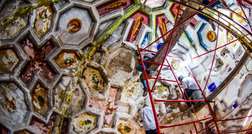 Francisco García, director de Centro Histórico y Patrimonio, informó que se tiene un 95 por ciento de avance en los trabajos de la base principal que correspondieron al reentortado y recubrimiento de las dos cúpulas, el desmantelado de instalaciones obsoletas y el inicio del proceso a cal viva e impermeabilización.