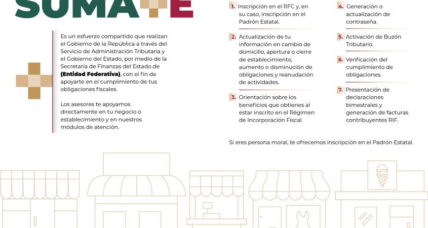 Derivado del Convenio de Colaboración Administrativa en materia del Régimen de Incorporación Fiscal (RIF), desde mediados del año 2017 a través del programa SÚMATE en el Edificio Administrativo, cualquier contribuyente podrá acudir y ser orientado respecto a sus obligaciones fiscales.