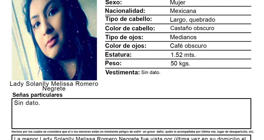 Toda una familia se encuentra desesperada por la desaparición de Solanlly Melissa Romero Negrete de 15 años de edad. La menor es vecina de la colonia Parques La Noria.