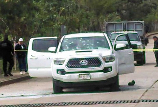 Corporaciones policiacas estatales y municipales, acompañadas por elementos de la Guardia Nacional acordonaron la escena del crimen donde quedó el vehículo atacado donde viajaba la víctima junto con su chófer.