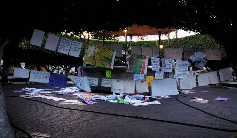 El Gobierno Municipal a través de la Dirección de Servicios Municipales decidió respetar la libertad expresión de las mujeres y no retirar las cartulinas y pancartas que dejaron en el kiosco del jardín principal desde el pasado 8 de marzo, día en que mil 300 mujeres participaron en la marcha de la conmemoración del Día Internacional de la Mujer.