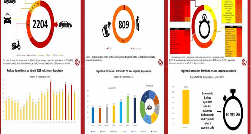 Durante el año 2019 acorde a los datos requeridos por medio de la plataforma de transparencia a la dirección de tránsito y movilidad del municipio de Irapuato se tuvo registro de un total de 1285 accidentes de tránsito lo cual indicó que cada 6 horas y 48 minutos aproximadamente se registra un accidente automovilístico en nuestra ciudad.