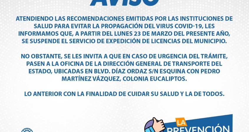 Con la finalidad de prevenir aglomeraciones en la oficina de expedición de licencia del Municipio, a partir del lunes 23 de marzo, queda suspendido este servicio.