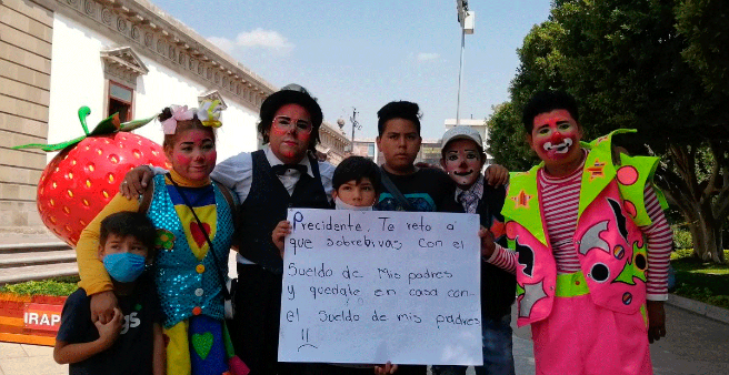 Payasitos de Irapuato acudieron a la Presidencia Municipal de Irapuato para solicitar apoyos económicos y de despensa para poder dar de comer a sus familias, pues cada uno es cabeza de al menos cuatro personas y la poca afluencia de gente y la suspensión de fiestas ha provocado que sus ingresos se reduzcan al máximo.