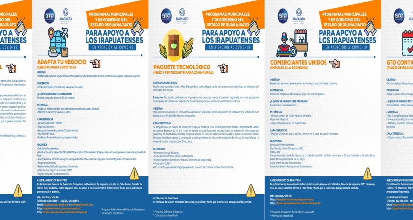 El gobierno local dio a conocer las bases para el Programa Municipal y de Gobierno del Estado, para el apoyo a los irapuatenses, ante la contingencia por Covid 19, a las que se podrá acceder a partir del lunes 6 de abril.Los programas están enfocados a personas mayores de 18 años y menores de 65 que, por la contingencia sanitaria, tuvieron que suspender sus labores de autoempleo o en algún centro de trabajo.