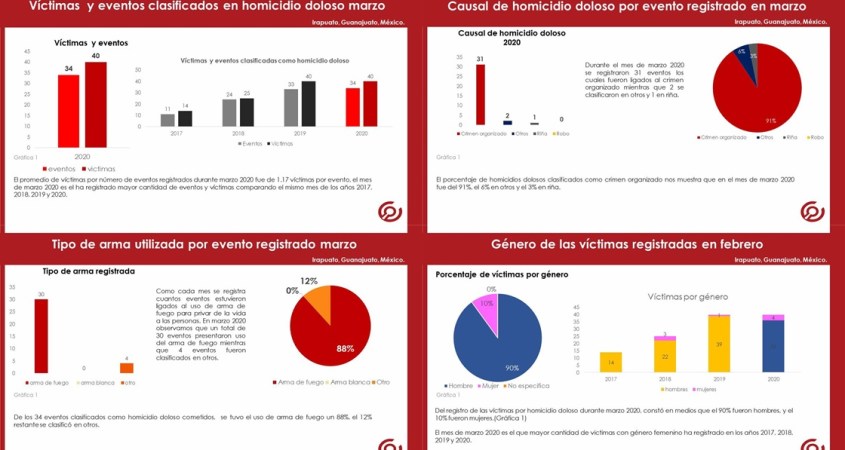 El reporte mensual de víctimas por homicidio doloso presenta la información condensada del registro de víctimas y eventos acontecidos en el municipio de Irapuato, Guanajuato.