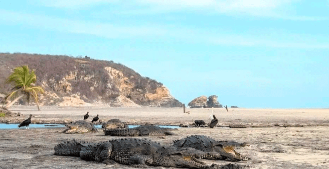 En Ventanilla, lugar ubicado entre Puerto Escondido y Huatulco, diversos cocodrilos han podido ser vistos aprovechando que no hay personas en las playas.