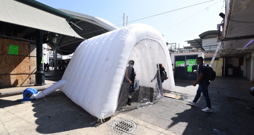 Uno de los accesos al mercado Miguel Hidalgo, ya cuenta con la instalación de un primer túnel sanitzante, esto, como una medida de prevención más, para evitar el incremento de contagios por Covid-19.
