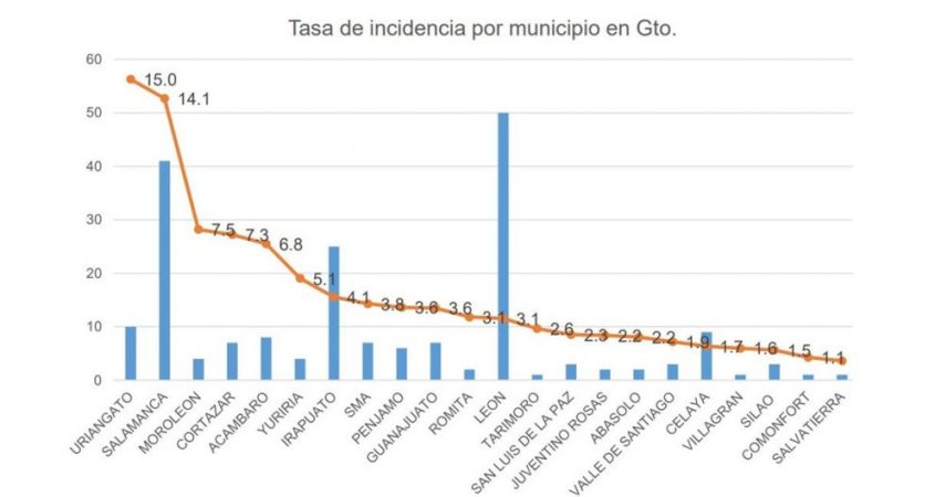 Sin embargo, al dividir el número de casos entre la población de cada municipio, arroja que Uriangato es el que ostenta el mayor índice de contagios, con una tasa de 15 personas infectadas por cada 100 mil habitantes, que es el doble de los 7.5 que promediaba apenas el viernes pasado, de acuerdo con datos que presentó ayer la Secretaría de Salud de Guanajuato.