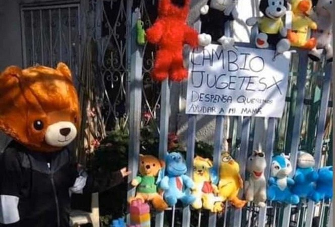 Ante la suspensión de actividades en empresas consideradas como no esenciales, la señora Yissel Ortiz Vega se quedó sin empleo, por lo que sus hijos Alexis e Itzel sacaron sus juguetes a la entrada de su casa y colocaron un anuncio en cartulina que a la letra decía: “Cambio juguetes por despensa, queremos ayudar a mi mamá”.