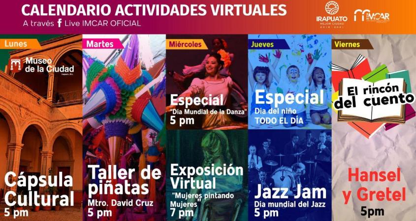 Atala Solorio Abreu, titular del IMCAR, comentó que, todas las actividades serán transmitidas en vivo, a partir de las 5 de la tarde este jueves 30 de abril, a través del facebook del Instituto Municipal de Cultura, Arte y Recreación.
