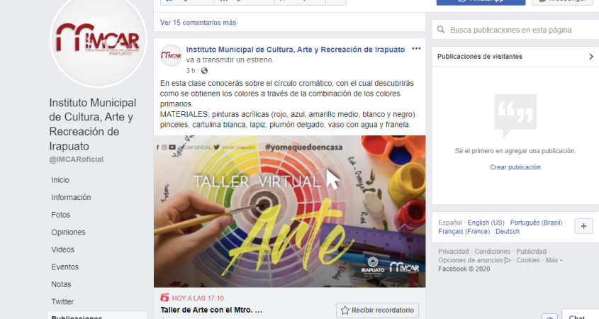 Además, todos los días, a las 5 de la tarde en la página de IMCAR Irapuato, las personas pueden ver los talleres, cuentos, lecturas dramatizados, dibujos de obras para los niños o links de eventos culturales, que se pueden disfrutar en familia y desde casa.
