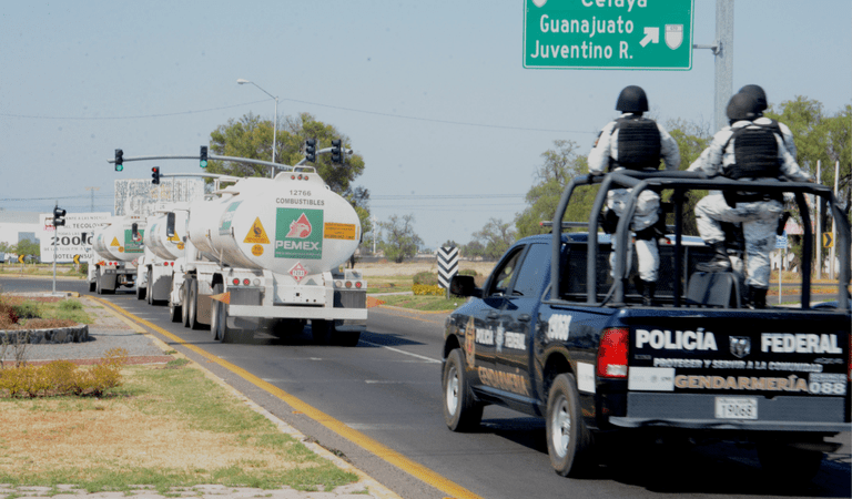 La mañana del lunes se observó la llegada de un convoy de 6 pipas de Pemex abastecidas con combustible, por la carretera San Miguel Allende- Celaya, custodiadas por elementos de la Guardia Nacional.