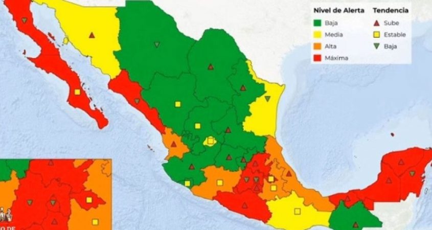 En este existen las marcas por nivel de alerta; las cuales son baja (verde), media (amarillo), alta (naranja) y máxima (rojo); pero además se presenta también la tendencia, respecto a si los casos se encuentran a la alza, a la baja o si están estables.