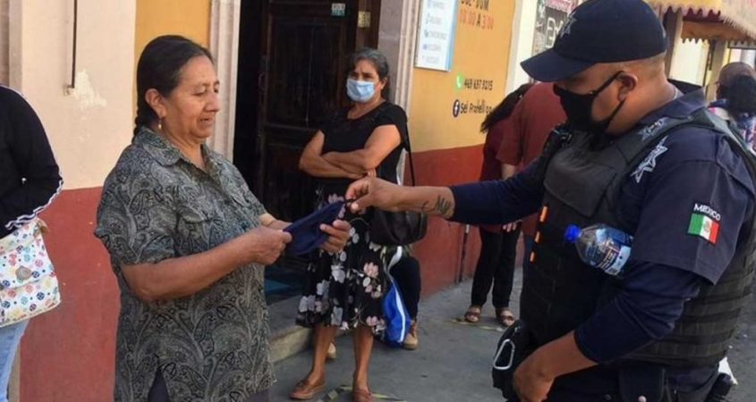 Durante sus recorridos de vigilancia en el primer cuadro de la ciudad, elementos de la Policía Municipal, cumpliendo con su labor de proximidad, entregaban cubrebocas a las personas y les exhortaban a respetar las recomendaciones sanitarias.