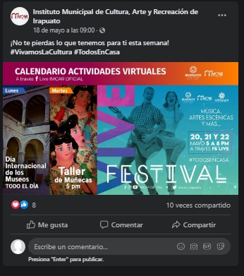 A través de las redes sociales del Instituto Municipal de Cultura Arte y Recreación (IMCAR), del 20 al 22 de mayo, se realizará la primera edición del Festival Vive Irapuato, en apoyo al talento local.