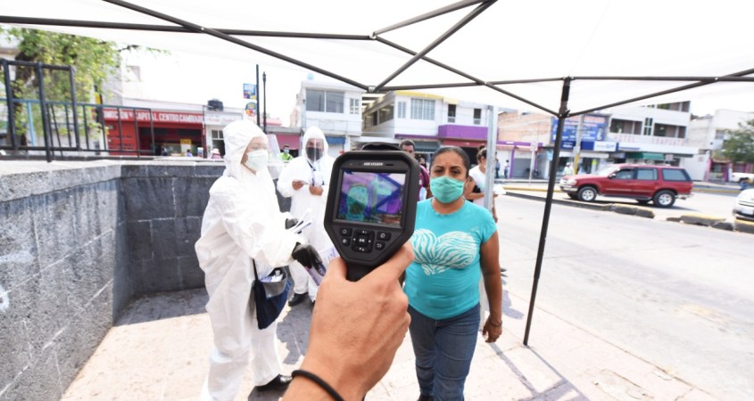 Con la ayuda de una cámara termográfica, personal de la Jurisdicción Sanitaria VI, realiza filtros para checar la temperatura de personas en las calles de mayor afluencia, con la finalidad de prevenir posibles contagios por coronavirus.