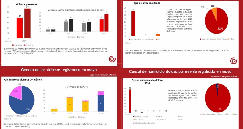 Durante mayo 2020 acorde a nuestro registro de homicidio doloso existió recuento de 39 eventos donde al menos una persona perdió la vida, por un total de 57 víctimas.