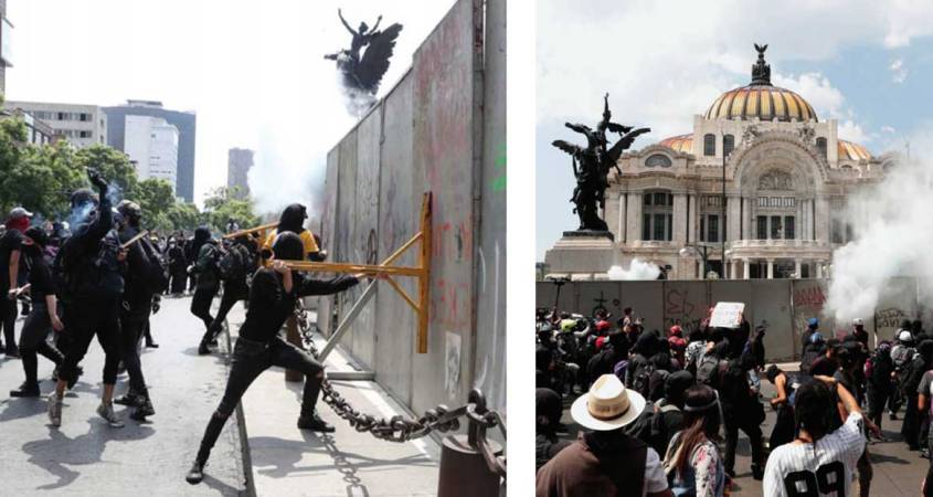 Cuando llegaron al Hemiciclo a Juárez derribaron las vallas metálicas que se instalaron para resguardarlo y lo vandalizaron, algunos, incluso, intentaron prenderle fuego. En la calle Madero, las agresiones continuaron, pero antes saquearon cuatro tiendas de conveniencia, dos de deportes e intentaron abrir una joyería.