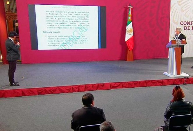 En conferencia en Palacio Nacional el mandatario mostró un presunto informe en el que se llama a sectores empresariales, partidos políticos opositores, comunicadores, organizaciones de la sociedad civil, entre otros, a formar un frente en contra de la actual administración.
