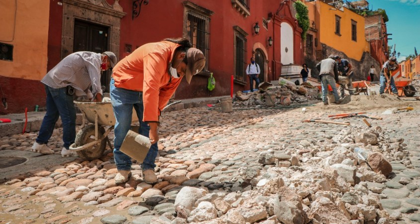 La pavimentación es de 2 tipos: piedra bola de río, ahogada en cemento y adoquín tipo San Luis, 30 x 30; cada pieza se coloca manualmente sobre base en tepetate.
