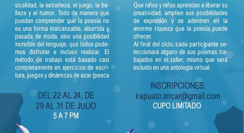 Previo al curso de verano, el IMCAR ofrecerá el taller de poesía Infantil, ‘Poemas para aprender a bucear’, impartido por Luis Eduardo García, actividades que tendrá cupo limitado para niños de 8 a 12 años.