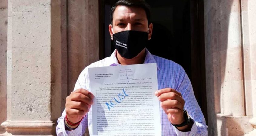 José Gutiérrez entregó un documento en el Palacio de Gobierno firmado por los colectivos donde se le advierte a Diego Sinhue que solo entablarán diálogo con él, por lo que levantarán la manifestación hasta que el mandatario los atienda de forma personal.