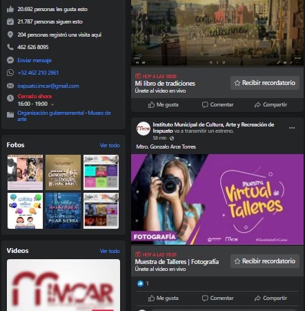 Taller de guitarra, ukulele, piano, teclado, violín, artes plásticas, fotografía, entre otros, son algunas de las muestras que se encuentran disponibles en el perfil de facebook del IMCAR para consulta de los irapuatenses. Las muestras se realizan en vivo en punto de las 7 de la noche.