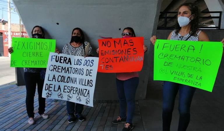 Esta mañana, cuatro integrantes de la mesa directiva de la colonia Villas de la Esperanza se manifestaron para pedir el cierre del crematorio de la funeraria la amistad ubicada en esa colonia.