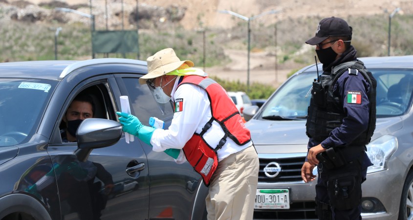 Elementos de Protección Civil, Policía y Tránsito Municipal vigilan el ingreso de personas a la ciudad para consultar el motivo de su visita, informar sobre los protocolos de sanidad, tomar la temperatura y otorgar cubre bocas a quienes no lo