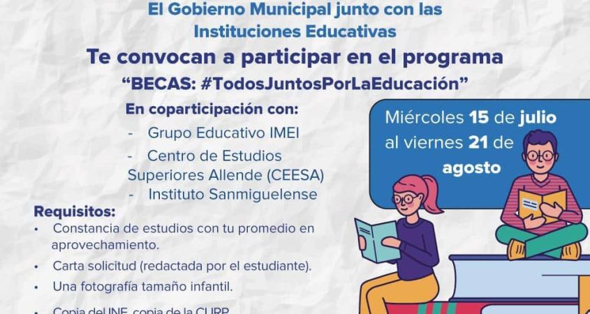 El Gobierno Municipal, a través de los regidores de la Comisión de Educación, firmó convenio de colaboración con el Instituto Sanmiguelense, Grupo Educativo IMEI y el Centro de Estudios Superiores Allende (CEESA). Son becas para jóvenes de nuevo ingreso a preparatoria, universidad y maestría. La convocatoria concluye el 21 de agosto.