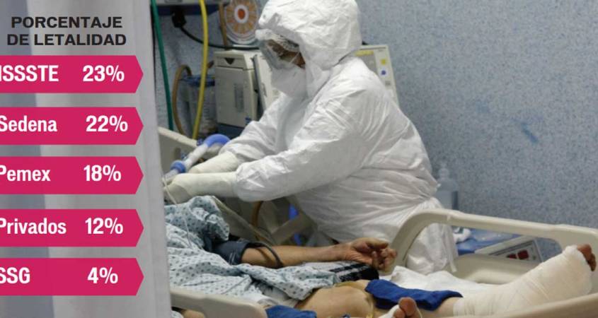 En segundo lugar está la Secretaría de la Defensa Nacional (Sedena), con una tasa de letalidad de 222 defunciones por cada 1 mil pacientes. Le sigue Pemex, con una tasa del 180.85.